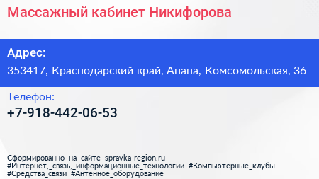 Массажный кабинет Никифорова по адресу 353417, Краснодарский край, Анапа, Комсомольская, 36 в дальнейшем Организация, размещена в следующих категориях: