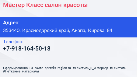 Мастер Класс, салон красоты по адресу 353440, Краснодарский край, Анапа, Кирова, 84 в дальнейшем Организация, размещена в следующих категориях: