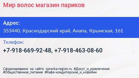 Мир волос, магазин париков по адресу 353440, Краснодарский край, Анапа, Крымская, 161 в дальнейшем Организация, размещена в следующих категориях: