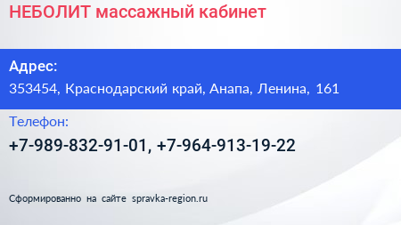 НЕБОЛИТ, массажный кабинет по адресу 353454, Краснодарский край, Анапа, Ленина, 161 в дальнейшем Организация, размещена в следующих категориях: