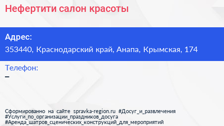 Нефертити, салон красоты по адресу 353440, Краснодарский край, Анапа, Крымская, 174 в дальнейшем Организация, размещена в следующих категориях:
