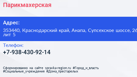 Парикмахерская по адресу 353440, Краснодарский край, Анапа, Супсехское шоссе, 26 лит 5 в дальнейшем Организация, размещена в следующих категориях: