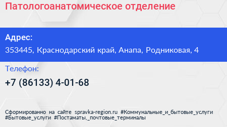 Патологоанатомическое отделение по адресу 353445, Краснодарский край, Анапа, Родниковая, 4 в дальнейшем Организация, размещена в следующих категориях: