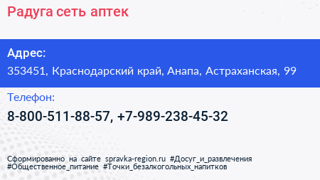 Радуга, сеть аптек по адресу 353451, Краснодарский край, Анапа, Астраханская, 99 в дальнейшем Организация, размещена в следующих категориях: