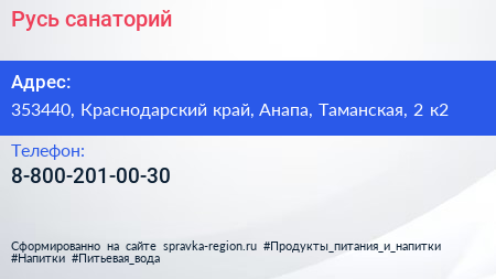 Русь, санаторий по адресу 353440, Краснодарский край, Анапа, Таманская, 2 к2 в дальнейшем Организация, размещена в следующих категориях: