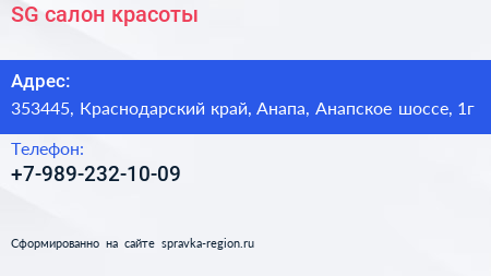 SG, салон красоты по адресу 353445, Краснодарский край, Анапа, Анапское шоссе, 1г в дальнейшем Организация, размещена в следующих категориях: