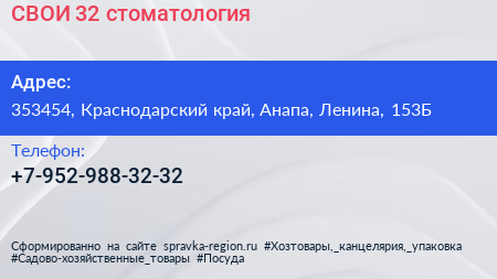 СВОИ 32, стоматология по адресу 353454, Краснодарский край, Анапа, Ленина, 153Б в дальнейшем Организация, размещена в следующих категориях: