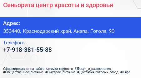 Сеньорита, центр красоты и здоровья по адресу 353440, Краснодарский край, Анапа, Гоголя, 90 в дальнейшем Организация, размещена в следующих категориях: