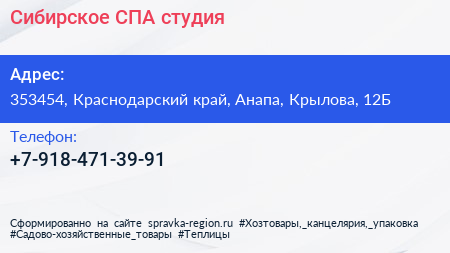 Сибирское СПА, студия по адресу 353454, Краснодарский край, Анапа, Крылова, 12Б в дальнейшем Организация, размещена в следующих категориях: