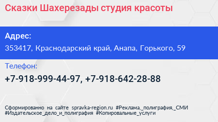 Сказки Шахерезады, студия красоты по адресу 353417, Краснодарский край, Анапа, Горького, 59 в дальнейшем Организация, размещена в следующих категориях:
