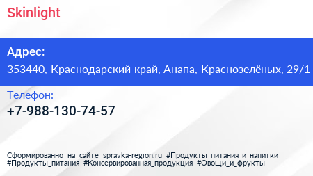 Skinlight по адресу 353440, Краснодарский край, Анапа, Краснозелёных, 29/1 в дальнейшем Организация, размещена в следующих категориях: