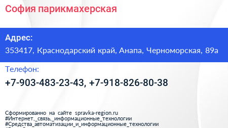 София, парикмахерская по адресу 353417, Краснодарский край, Анапа, Черноморская, 89а в дальнейшем Организация, размещена в следующих категориях: