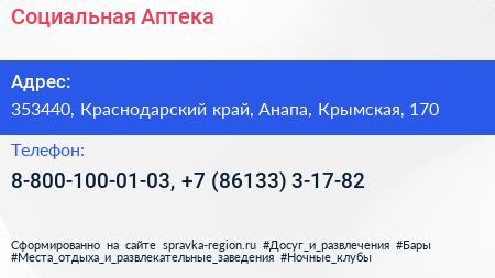 Социальная Аптека по адресу 353440, Краснодарский край, Анапа, Крымская, 170 в дальнейшем Организация, размещена в следующих категориях:
