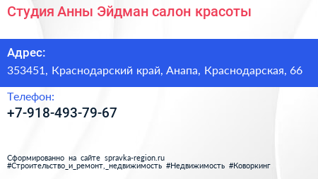 Студия Анны Эйдман, салон красоты по адресу 353451, Краснодарский край, Анапа, Краснодарская, 66 в дальнейшем Организация, размещена в следующих категориях: