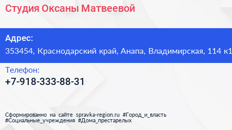 Студия Оксаны Матвеевой по адресу 353454, Краснодарский край, Анапа, Владимирская, 114 к1 в дальнейшем Организация, размещена в следующих категориях: