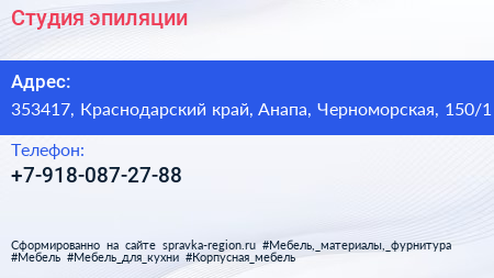 Студия эпиляции по адресу 353417, Краснодарский край, Анапа, Черноморская, 150/1 в дальнейшем Организация, размещена в следующих категориях: