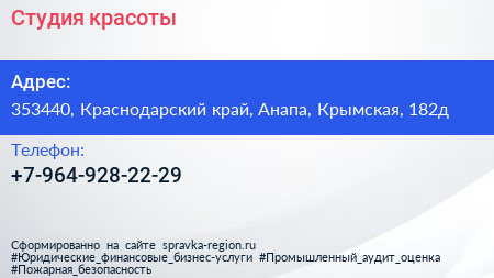 Студия красоты по адресу 353440, Краснодарский край, Анапа, Крымская, 182д в дальнейшем Организация, размещена в следующих категориях: