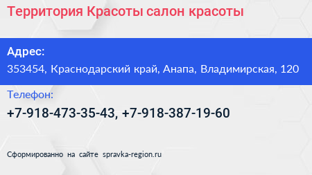 Территория Красоты, салон красоты по адресу 353454, Краснодарский край, Анапа, Владимирская, 120 в дальнейшем Организация, размещена в следующих категориях: