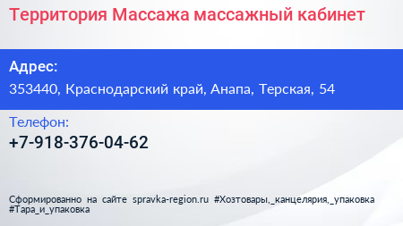 Территория Массажа, массажный кабинет по адресу 353440, Краснодарский край, Анапа, Терская, 54 в дальнейшем Организация, размещена в следующих категориях: