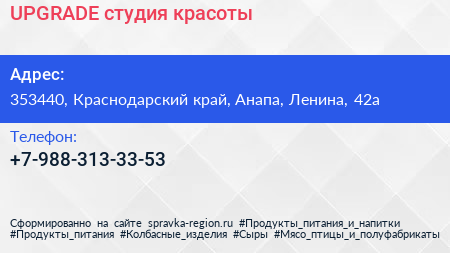 UPGRADE, студия красоты по адресу 353440, Краснодарский край, Анапа, Ленина, 42а в дальнейшем Организация, размещена в следующих категориях: