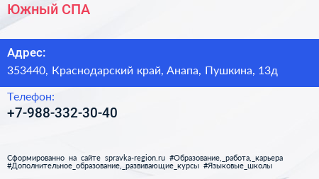 Южный СПА по адресу 353440, Краснодарский край, Анапа, Пушкина, 13д в дальнейшем Организация, размещена в следующих категориях: