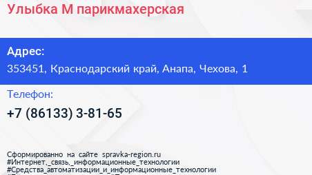 Улыбка-М, парикмахерская по адресу 353451, Краснодарский край, Анапа, Чехова, 1 в дальнейшем Организация, размещена в следующих категориях: