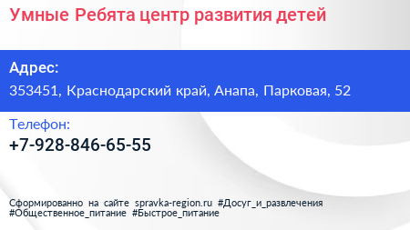 Умные Ребята, центр развития детей по адресу 353451, Краснодарский край, Анапа, Парковая, 52 в дальнейшем Организация, размещена в следующих категориях: