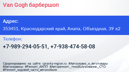 Van Gogh, барбершоп по адресу 353451, Краснодарский край, Анапа, Объездная, 39 к2 в дальнейшем Организация, размещена в следующих категориях: