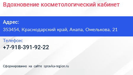 Вдохновение, косметологический кабинет по адресу 353454, Краснодарский край, Анапа, Омелькова, 21 в дальнейшем Организация, размещена в следующих категориях: