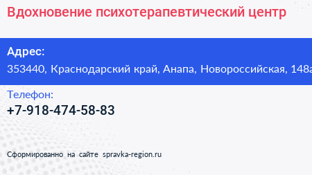 Вдохновение, психотерапевтический центр по адресу 353440, Краснодарский край, Анапа, Новороссийская, 148а в дальнейшем Организация, размещена в следующих категориях: