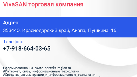 VivaSAN, торговая компания по адресу 353440, Краснодарский край, Анапа, Пушкина, 16 в дальнейшем Организация, размещена в следующих категориях: