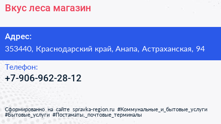 Вкус леса, магазин по адресу 353440, Краснодарский край, Анапа, Астраханская, 94 в дальнейшем Организация, размещена в следующих категориях: