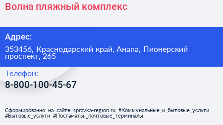 Волна, пляжный комплекс по адресу 353456, Краснодарский край, Анапа, Пионерский проспект, 265 в дальнейшем Организация, размещена в следующих категориях: