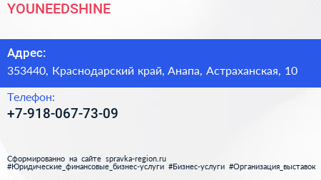 YOUNEEDSHINE по адресу 353440, Краснодарский край, Анапа, Астраханская, 10 в дальнейшем Организация, размещена в следующих категориях: