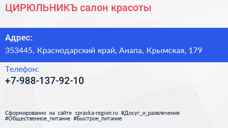 ЦИРЮЛЬНИКЪ, салон красоты по адресу 353445, Краснодарский край, Анапа, Крымская, 179 в дальнейшем Организация, размещена в следующих категориях: