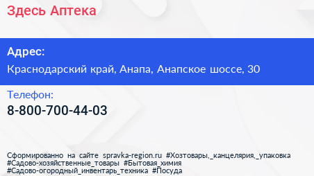 Здесь Аптека по адресу Краснодарский край, Анапа, Анапское шоссе, 30 в дальнейшем Организация, размещена в следующих категориях: