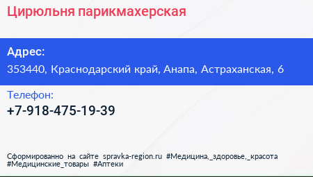 Цирюльня, парикмахерская по адресу 353440, Краснодарский край, Анапа, Астраханская, 6 в дальнейшем Организация, размещена в следующих категориях: