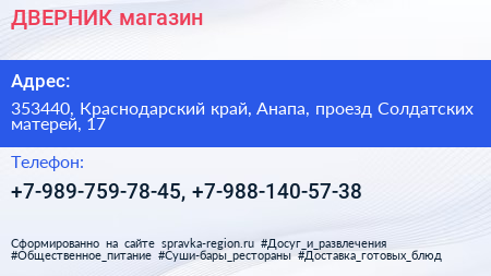 ДВЕРНИК, магазин по адресу 353440, Краснодарский край, Анапа, проезд Солдатских матерей, 17 в дальнейшем Организация, размещена в следующих категориях: