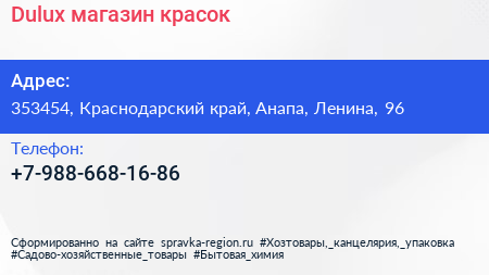 Dulux, магазин красок по адресу 353454, Краснодарский край, Анапа, Ленина, 96 в дальнейшем Организация, размещена в следующих категориях: