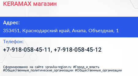 KERAMAX, магазин по адресу 353451, Краснодарский край, Анапа, Объездная, 1 в дальнейшем Организация, размещена в следующих категориях: