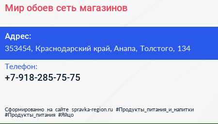 Мир обоев, сеть магазинов по адресу 353454, Краснодарский край, Анапа, Толстого, 134 в дальнейшем Организация, размещена в следующих категориях:
