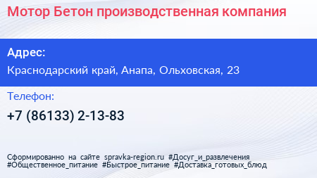 Мотор-Бетон, производственная компания по адресу Краснодарский край, Анапа, Ольховская, 23 в дальнейшем Организация, размещена в следующих категориях: