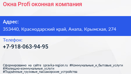 Окна Profi, оконная компания по адресу 353440, Краснодарский край, Анапа, Крымская, 274 в дальнейшем Организация, размещена в следующих категориях: