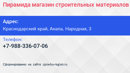 Пирамида, магазин строительных материалов по адресу Краснодарский край, Анапа, Народная, 3 в дальнейшем Организация, размещена в следующих категориях:
