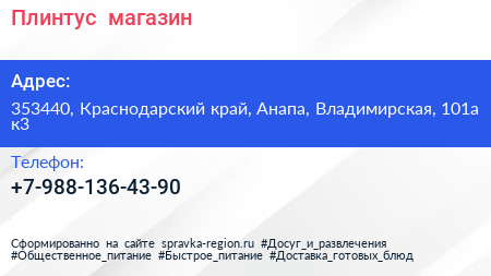 Плинтус+, магазин по адресу 353440, Краснодарский край, Анапа, Владимирская, 101а к3 в дальнейшем Организация, размещена в следующих категориях: