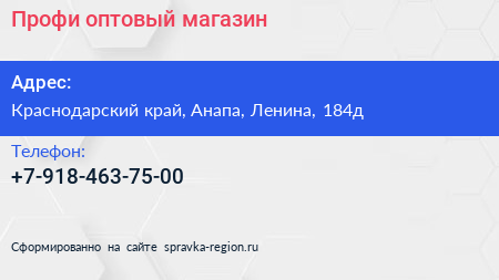 Профи, оптовый магазин по адресу Краснодарский край, Анапа, Ленина, 184д в дальнейшем Организация, размещена в следующих категориях: