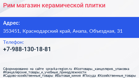 Рим, магазин керамической плитки по адресу 353451, Краснодарский край, Анапа, Объездная, 31 в дальнейшем Организация, размещена в следующих категориях: