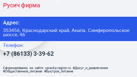 Русич, фирма по адресу 353456, Краснодарский край, Анапа, Симферопольское шоссе, 46 в дальнейшем Организация, размещена в следующих категориях: