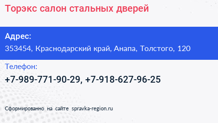 Торэкс, салон стальных дверей по адресу 353454, Краснодарский край, Анапа, Толстого, 120 в дальнейшем Организация, размещена в следующих категориях: