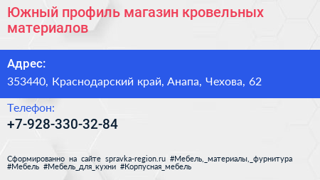 Южный профиль, магазин кровельных материалов по адресу 353440, Краснодарский край, Анапа, Чехова, 62 в дальнейшем Организация, размещена в следующих категориях: